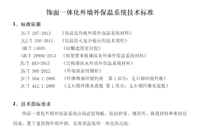 通合實業(yè)集團結(jié)合企業(yè)保溫裝飾一體板案例,就國家標準規(guī)范,整理出一套飾面一體化外墻保溫系統(tǒng)技術(shù)標準,主要國家依據(jù)標準為: